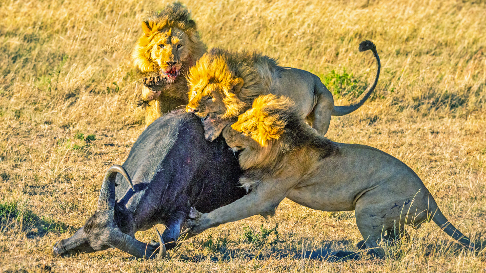 • Attack: When close enough, lions burst forward with speeds up to 37 mph. They use their claws and canines to bring down prey, usually aiming for the neck or head to quickly incapacitate.